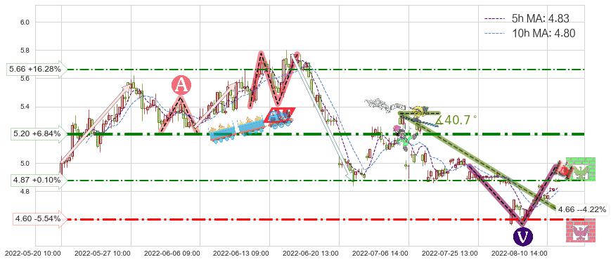 ♘ 阻力价格位4.87,可信任强度39.33%,距离最后交易2022-08-12 14:00形成的收盘价格4.87相差 +0.10%