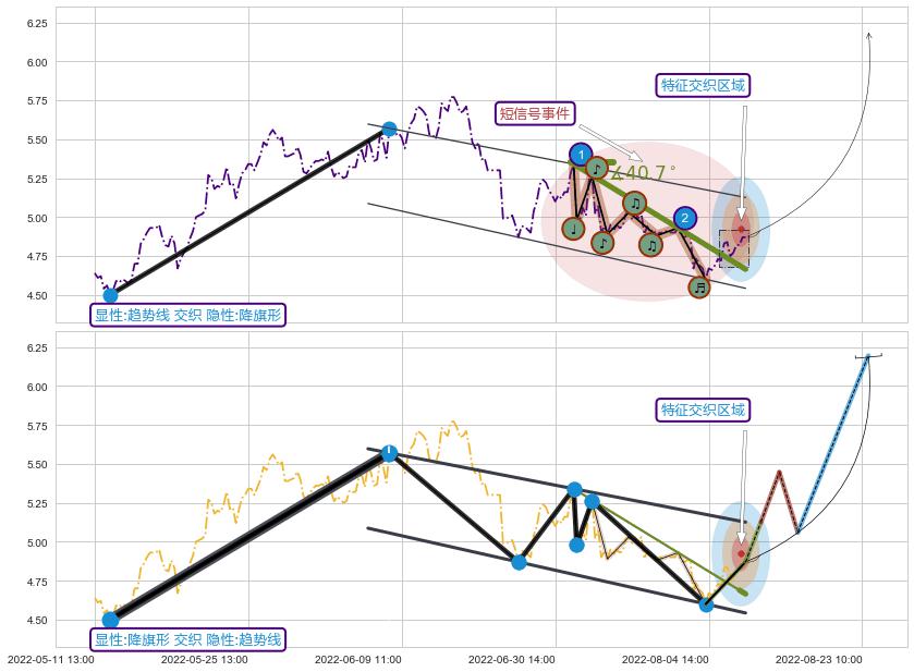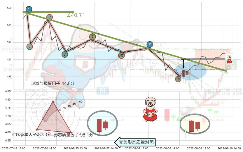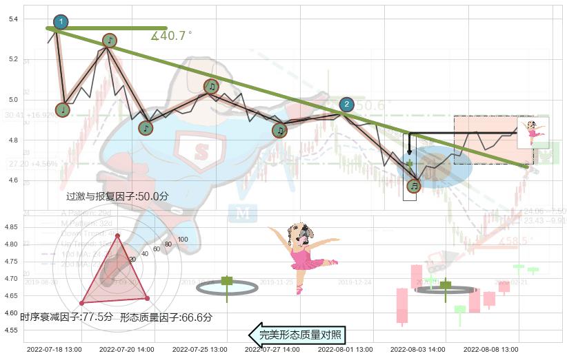 ➢ 2022-07-05 13:00-2022-08-11 14:00下跌趋势存在反转上涨[机会],其原下跌趋势的阻力位(4.66)已被突破[强支撑信号],原下跌趋势角度: 40.7˚