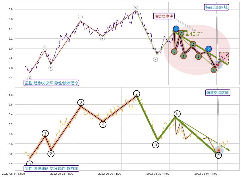 ➣ 2022-07-05 13:00-2022-08-11 14:00下跌趋势存在反转上涨[机会],其原下跌趋势的阻力位(4.66)已被突破[强支撑信号],原下跌趋势角度: 40.7˚