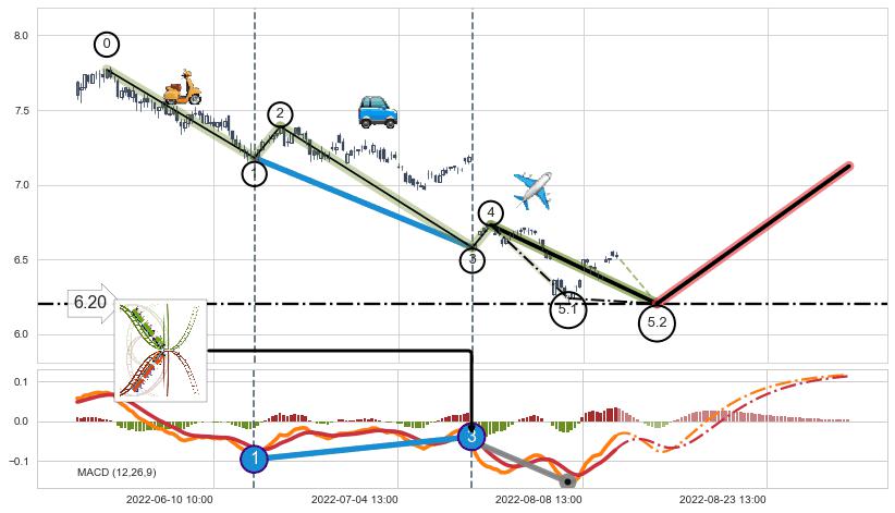➣ 波浪理论:猜想即将止跌 → 上涨 →【拐点】浪5临近 → 大趋势均值回复