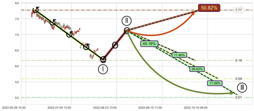 ♘ 阻力价格位7.07,可信任强度56.40%,距离最后交易2022-08-12 14:00形成的收盘价格6.53相差 +8.30%