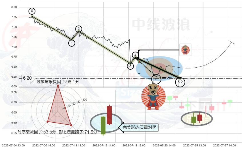 从2022-04-06 14:00至2022-08-12 13:00,共包含325个小时,阶段股价下跌-22.49%,阶段股价变动位移路程比: 1 : 9,下跌趋势角度: 39.1,2022-07-18 13:00向↘︎形成缺口,跳空下跌-8.48%˚