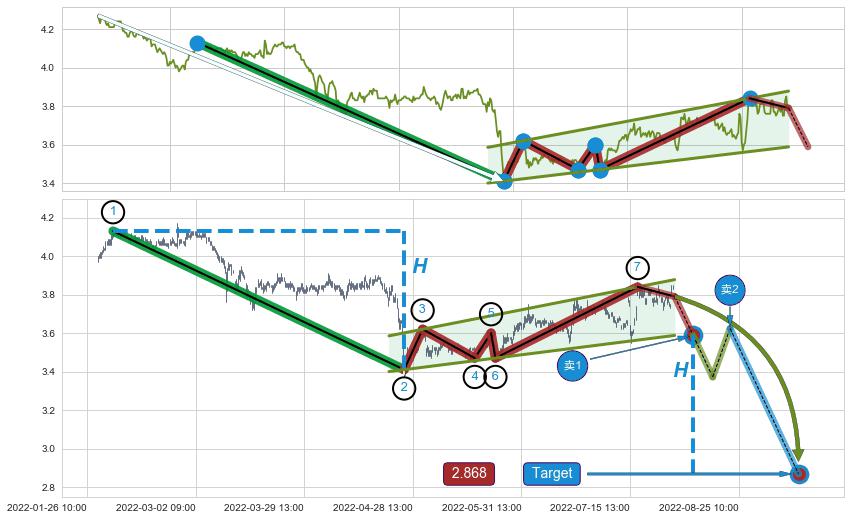➣ 降旗形:猜想预期上涨目标target即将达成,随后猜想强阻力来临,预期回调下跌(均值回复)