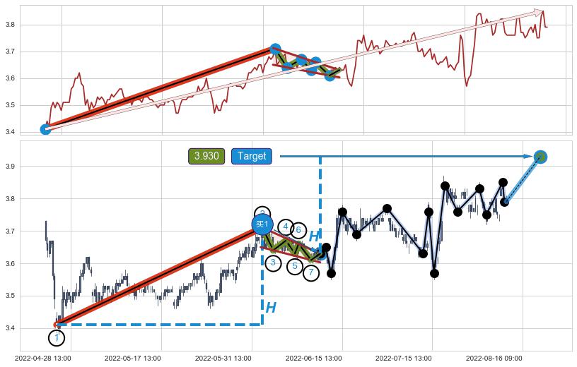➣ 趋势线:阻力位已击穿突破,猜想持续向上拉升上涨 → 上涨 →【突破】机会信号 → 大周期均值回复
