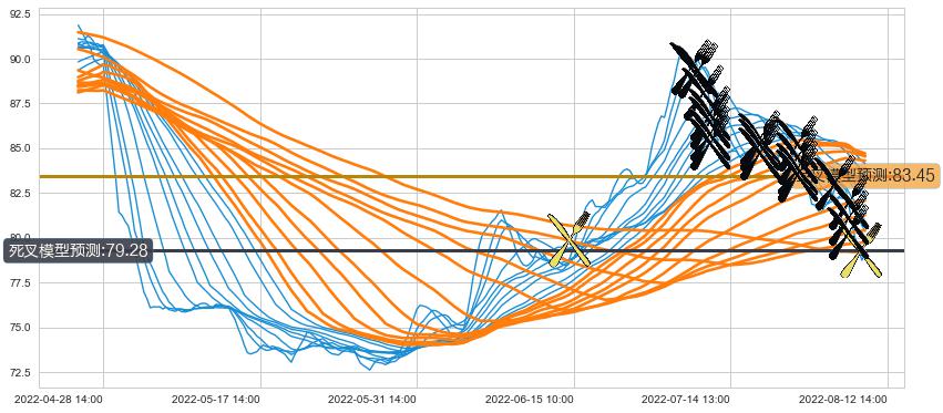 ➣ 90小时均线于(07-28 14:00: 83.79)形成【死叉】基于【死叉历史模型】预测死叉后最低波谷价格: 80.02, 死叉后最低价格78.03,已经下跌超出预测最低波谷价格, 预期反弹