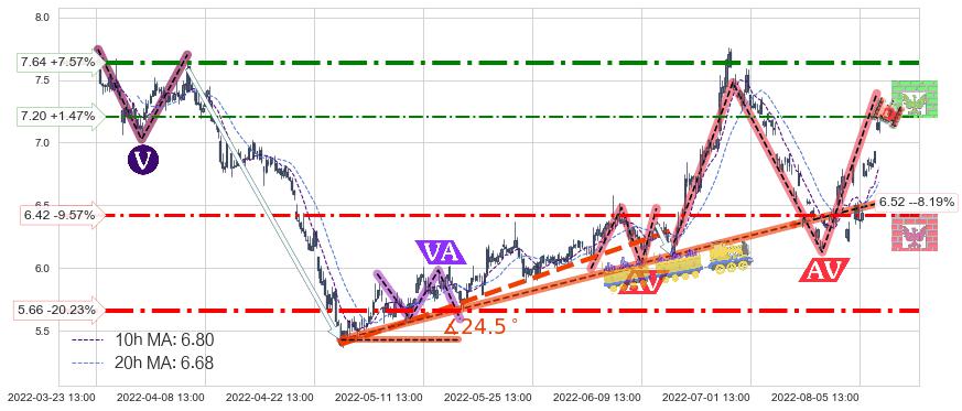 ♘ 阻力价格位7.20,可信任强度51.42%,距离最后交易2022-08-12 14:00形成的收盘价格7.10相差 +1.47%