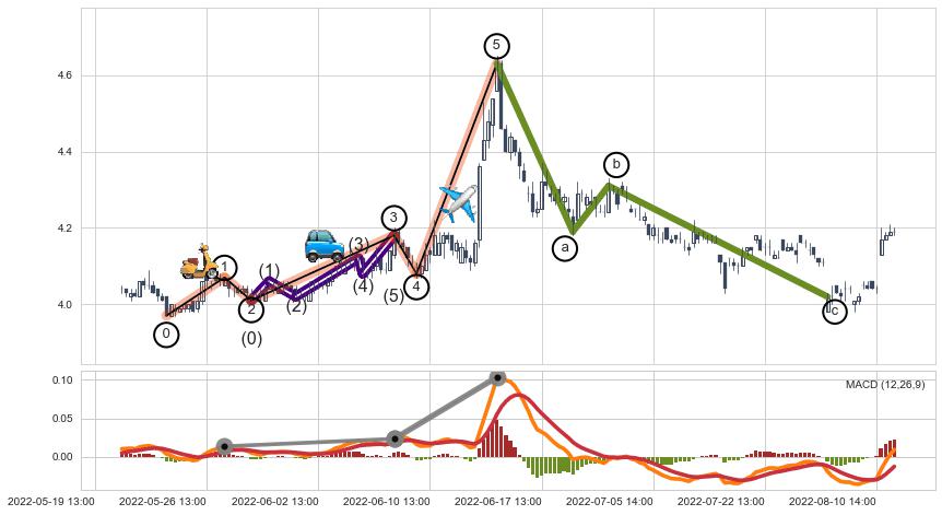 ➣ 波浪理论:猜想达到c点后小反弹终止反转下跌 → 下跌 → 【拐点】临近 → 阶段均值回复结束后继续大周期趋势跟踪