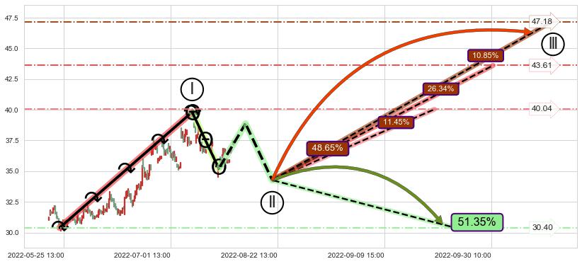 ➣ 高概率大级别循环上涨浪被破坏,反转向下(突破5浪起点)概率51.35%