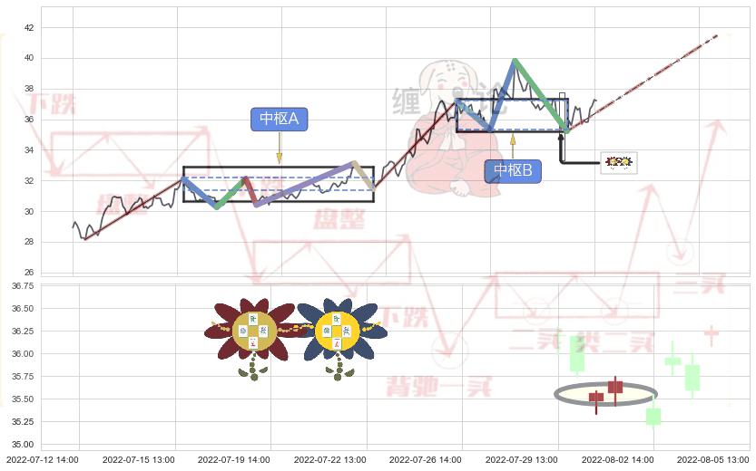 ➣ 【中枢B】:06-27:13-08-02:14,中枢由4笔构成,共54交易小时, ZG=37.20, ZD=35.32