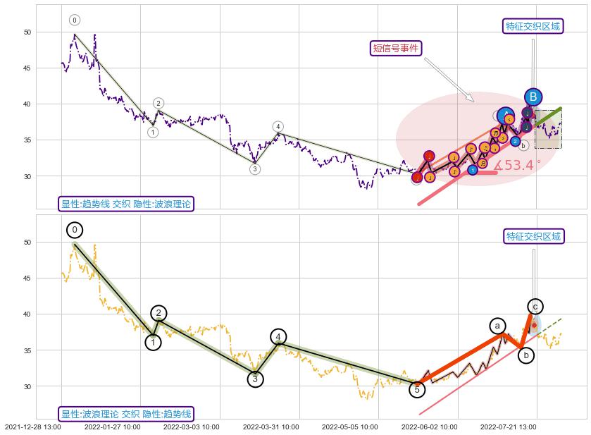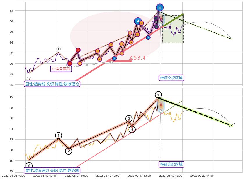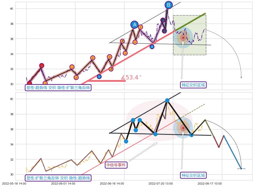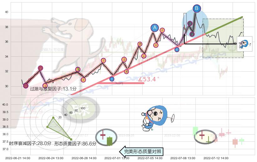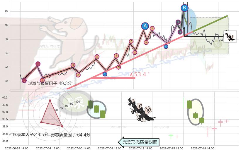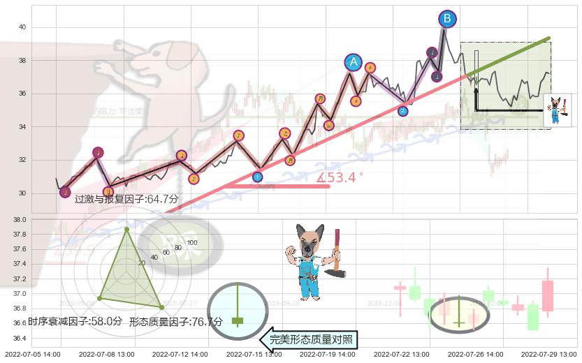 ➢ 2022-05-19 13:00-2022-07-21 14:00上升趋势存在反转[风险],其原上升趋势的支撑位(39.33)已破位[强阻力信号],原上升趋势角度: 53.4˚