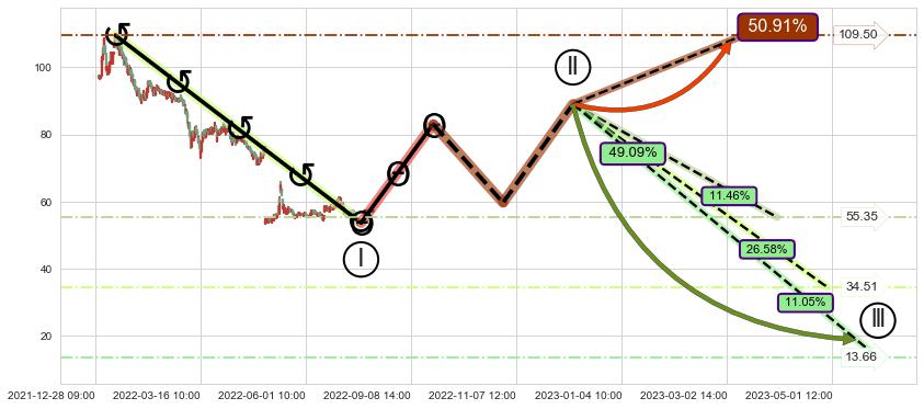 ➢ 循环浪继续向下【最低】位置(05-25:11, 13.66),匹配聚类样本比例22.51%, 可能性概率11.05%