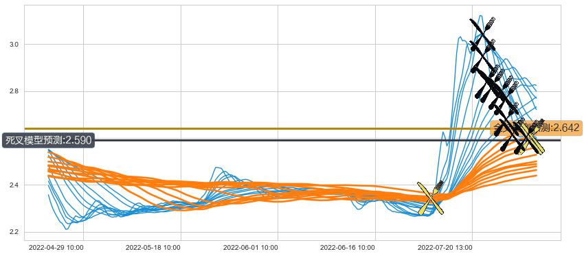 ➢ 15小时均线于(07-22 14:00: 3.038)形成【死叉】基于【死叉历史模型】预测死叉后最低波谷价格: 2.974, 死叉后最低价格2.560,已经下跌超出预测最低波谷价格, 预期反弹