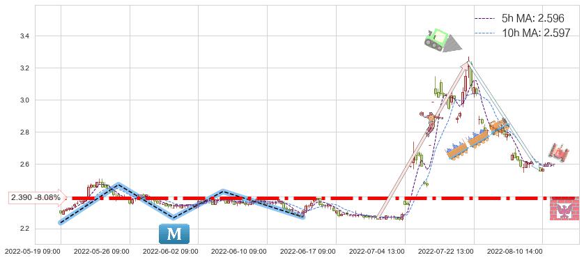 ♘ 支撑价格位2.390,可信任强度95.53%,距离最后交易2022-08-12 14:00形成的收盘价格2.600相差 -8.08%