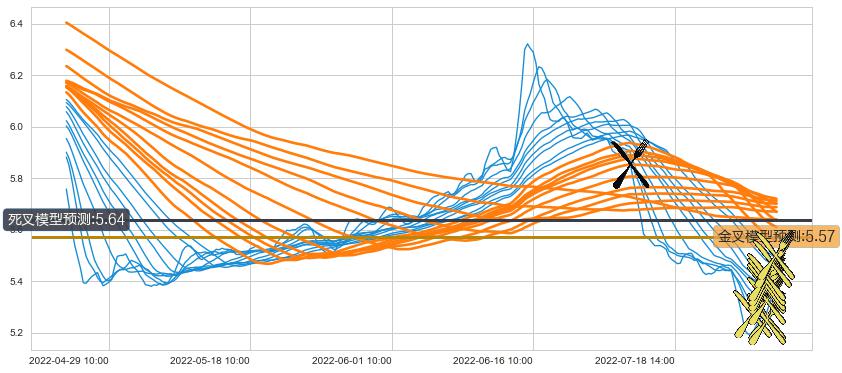 ➢ 100小时均线于(07-06 14:00: 5.85)形成【死叉】基于【死叉历史模型】预测死叉后最低波谷价格: 5.64, 死叉后最低价格5.17,已经下跌超出预测最低波谷价格, 预期反弹