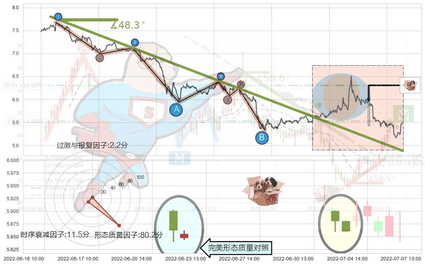 从2022-01-05 10:00至2022-05-06 13:00,共包含387个小时,阶段股价下跌-33.84%,阶段股价变动位移路程比: 1 : 5,下跌趋势角度: 48.3