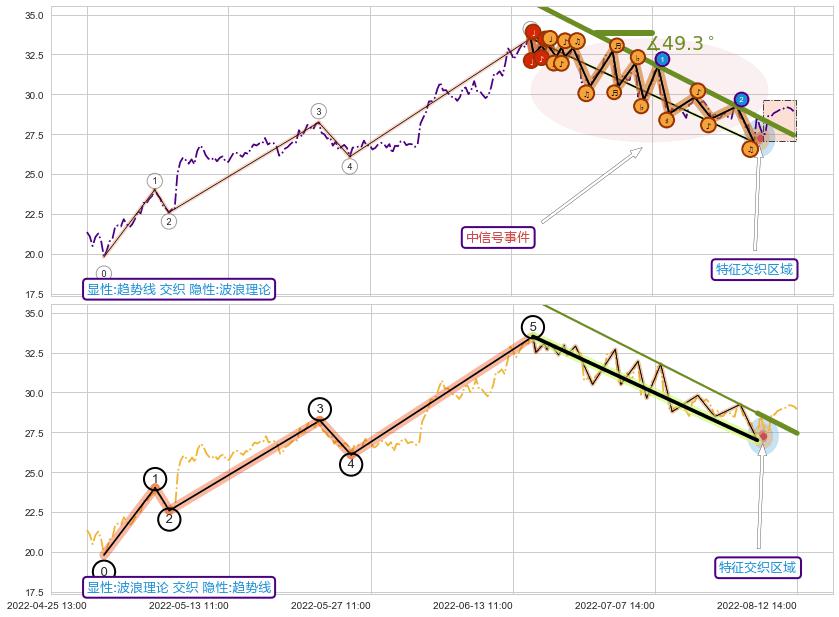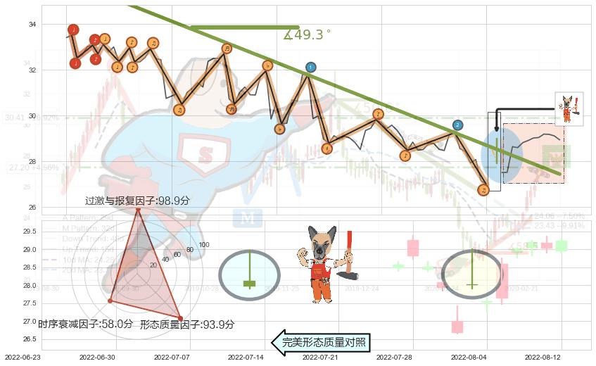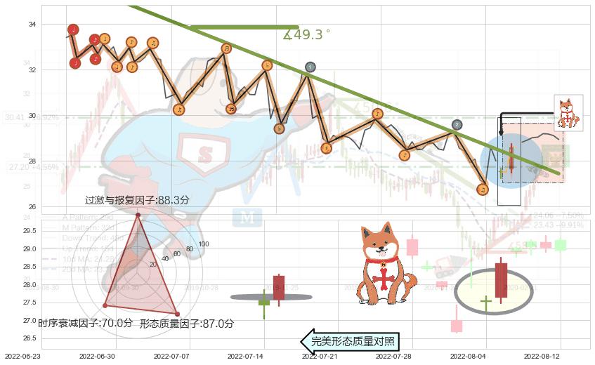 ➢ 2022-06-14 14:00-2022-08-02 14:00下跌趋势存在反转上涨[机会],其原下跌趋势的阻力位(27.44)已被突破[强支撑信号],原下跌趋势角度: 49.3˚