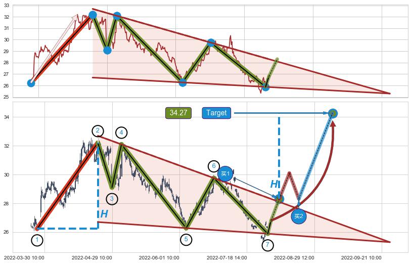 ➢ 最小中继整理涨幅→𝐇: 5.97 (𝐇楔型旗杆的长度:楔型起点→顶点)