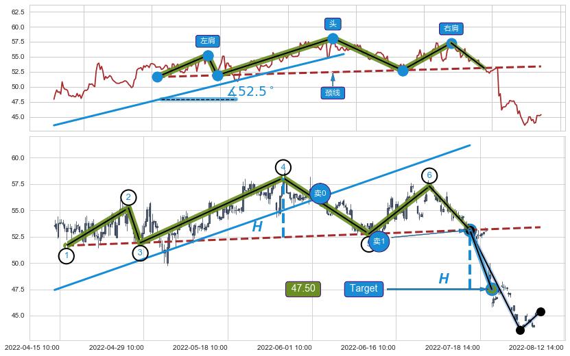 从2022-03-23 14:00至2022-05-30 11:00,共包含214个小时,阶段股价上涨17.45%,阶段股价变动位移路程比: 1 : 10,上涨趋势角度: 52.5