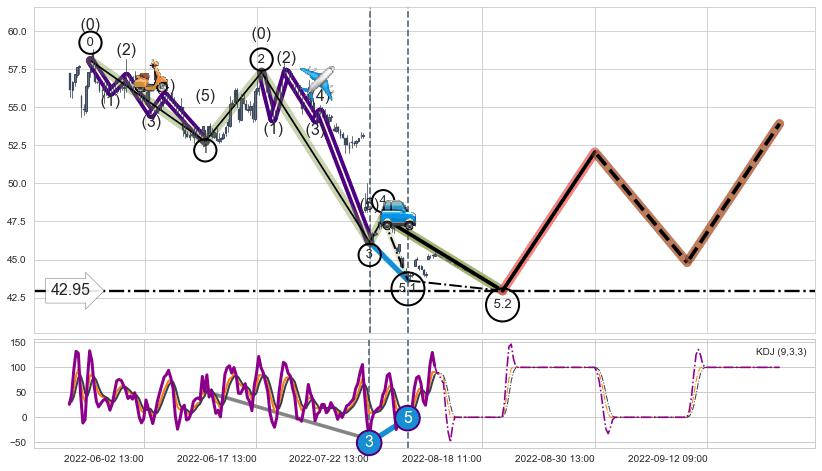 ➢ 5.1: 预测当前第5浪位置(08-03:14, 43.62),仍然有下跌空间