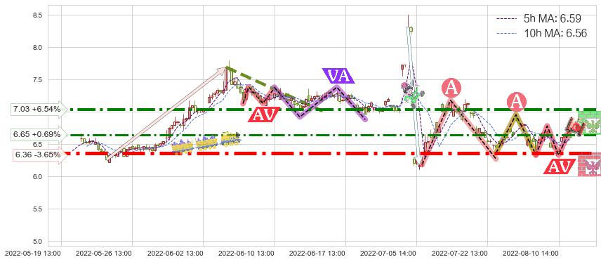 ♘ 阻力价格位6.65,可信任强度57.20%,距离最后交易2022-08-12 14:00形成的收盘价格6.60相差 +0.69%