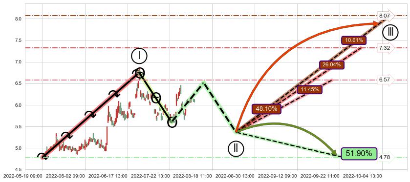 ♘ 阻力价格位6.11,可信任强度53.31%,距离最后交易2022-08-12 14:00形成的收盘价格6.09相差 +0.29%