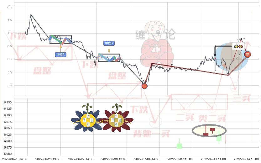➣ 【中枢B】:03-17:14-04-07:09,中枢由6笔构成,共62交易小时, ZG=6.05, ZD=6.02