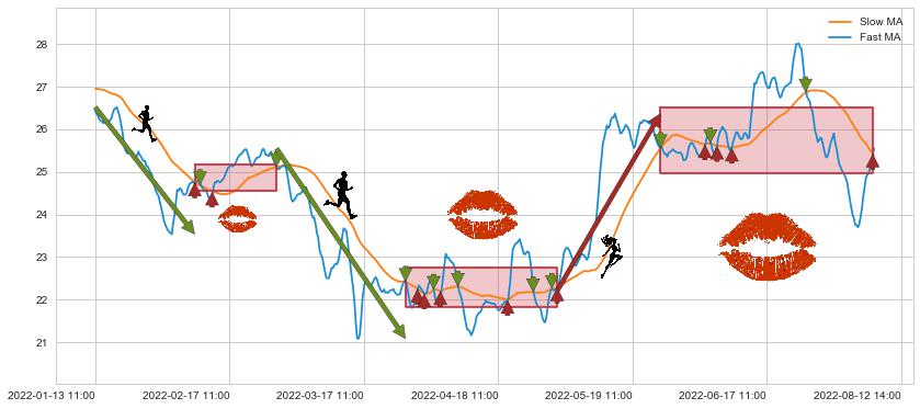 01-13 11:00至02-10 10:00 慢线与快线呈空头排列, 慢线与快线接触少,无缠绕