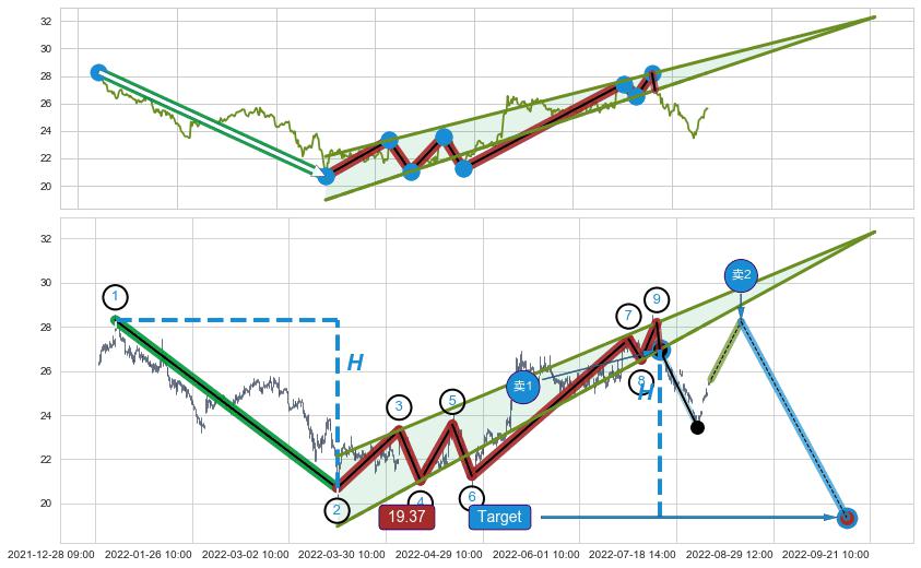 ➢ 最小中继整理跌幅→𝐇: 7.60 (𝐇楔型旗杆的长度:楔型起点→顶点)