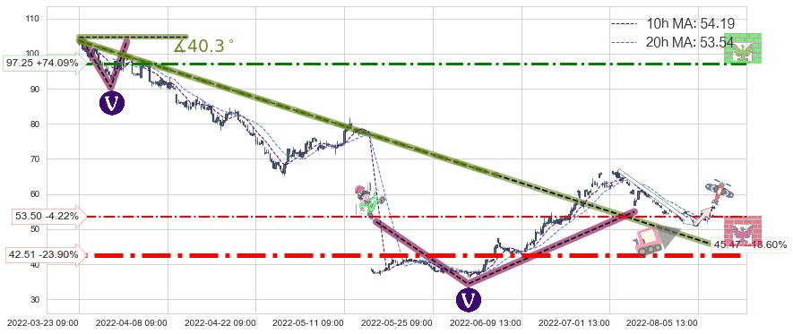 从2022-03-23 09:00至2022-06-06 10:00,共包含237个小时,阶段股价下跌-59.15%,阶段股价变动位移路程比: 1 : 5,下跌趋势角度: 40.3,2022-05-16 09:00向↘︎形成缺口,跳空下跌-50.02%˚
