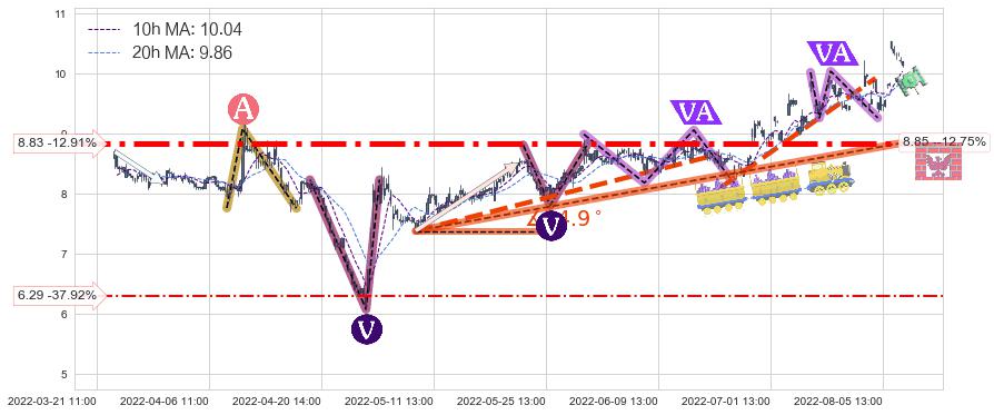 ♘ 在最后的上升阶段2022-05-10 09:00至2022-08-12 14:00存在 持续未破位的支撑位 ,支撑价格8.85,支撑可信任强度74.39%,其距离最后价格10.14相差 -12.75%