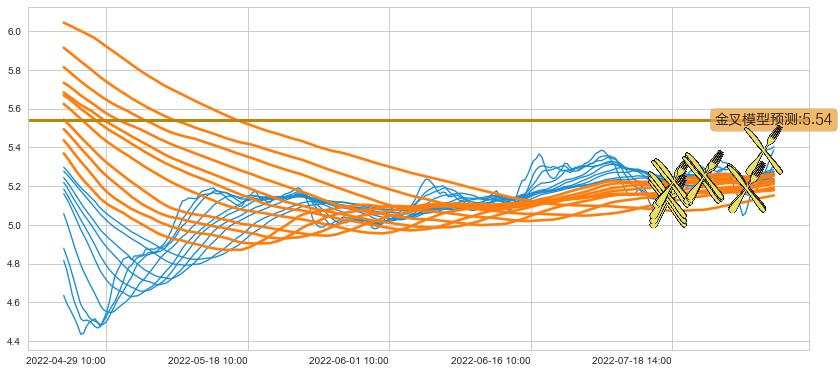 ➢ 40小时均线于(07-25 14:00: 5.23)形成【金叉】基于【金叉历史模型】预测金叉后最高波峰价格: 5.51, 金叉后最高价格5.43,尚未达到预测最高波峰价格, 预期继续上涨