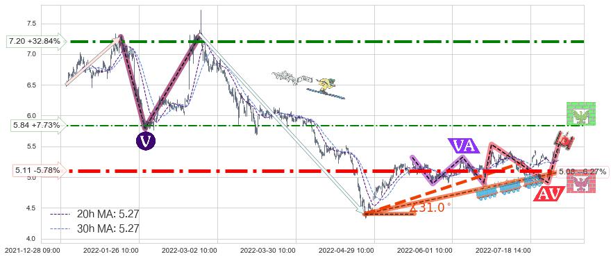♘ 阻力价格位5.84,可信任强度48.00%,距离最后交易2022-08-12 14:00形成的收盘价格5.42相差 +7.73%