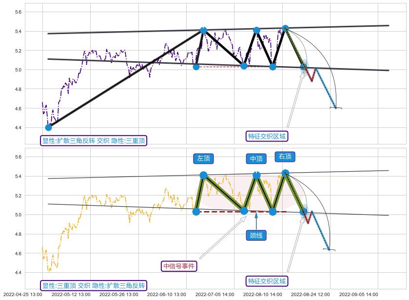 ➢ 三重顶属【中级别信号事件】扩散三角反转属【长级别信号事件】中长周期组合信号事件,中长事件长度比38.55%