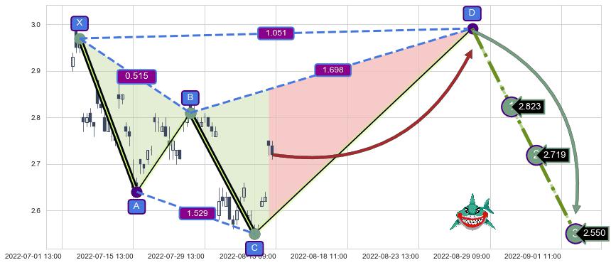 ➣ 未完成【鲨鱼】形态起点X: 07-05:14, 已到达C点: 08-10:13, 预测最终D点: 08-26:10, 共110交易小时