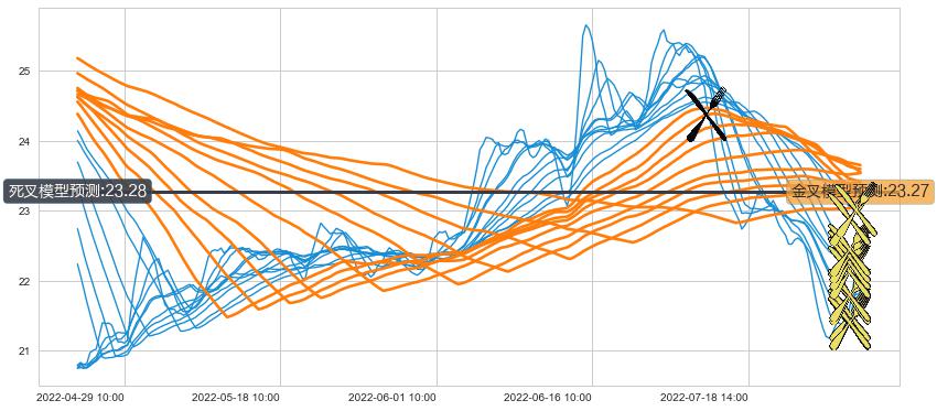 ➢ 80小时均线于(07-07 14:00: 24.37)形成【死叉】基于【死叉历史模型】预测死叉后最低波谷价格: 23.28, 死叉后最低价格21.00,已经下跌超出预测最低波谷价格, 预期反弹