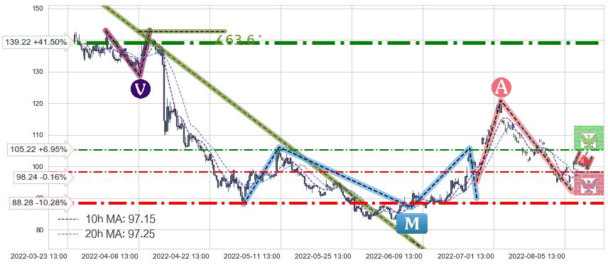 ♘ 阻力价格位105.22,可信任强度47.85%,距离最后交易2022-08-12 14:00形成的收盘价格98.39相差 +6.95%