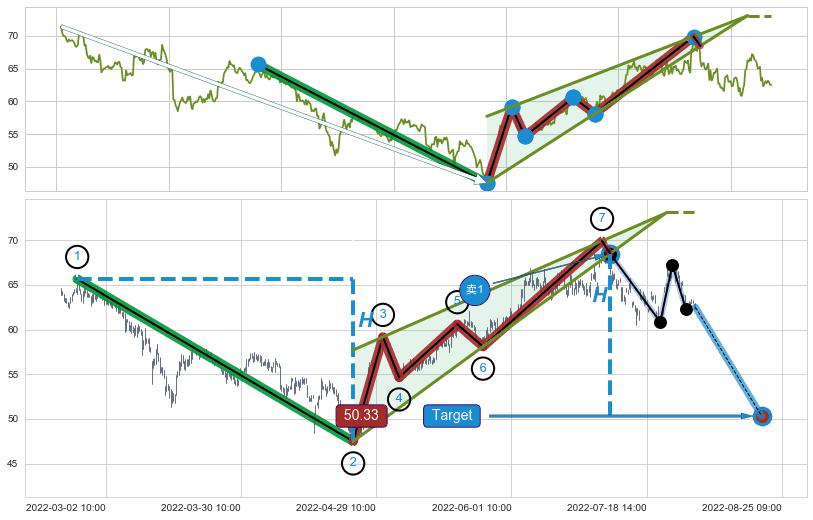 ➢ 最小中继整理跌幅→𝐇: 18.15 (𝐇楔型旗杆的长度:楔型起点→顶点)