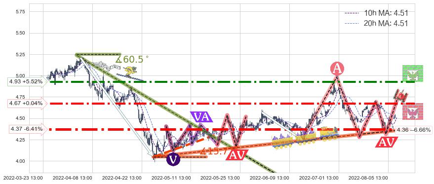 ♘ 阻力价格位4.93,可信任强度71.14%,距离最后交易2022-08-12 14:00形成的收盘价格4.67相差 +5.52%