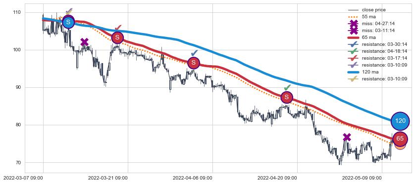 📝 多条均线形成死叉后走势最低价格达到: 84.66
