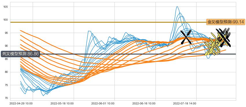 ➢ 70小时均线于(07-08 13:00: 93.14)形成【死叉】基于【死叉历史模型】预测死叉后最低波谷价格: 85.02, 死叉后最低价格84.66,虽然已经到达预测最低波谷价格,但耗时间很短动能很强, 预期继续下跌