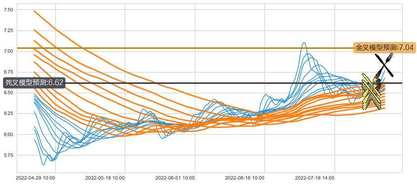 ➢ 5小时均线于(08-12 13:00: 6.82)形成【死叉】基于【死叉历史模型】预测死叉后最低波谷价格: 6.62, 死叉后最低价格6.84,已经下跌超出预测最低波谷价格, 预期反弹