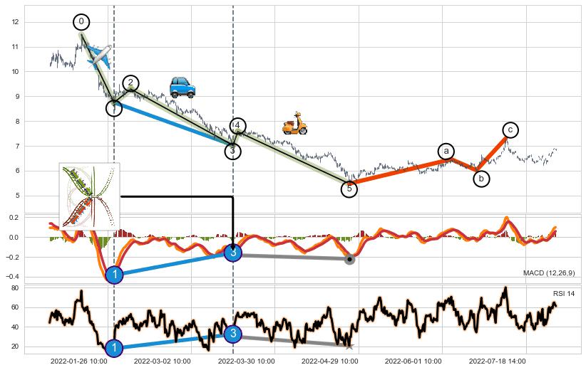 ➣ 波浪理论:猜想达到c点后小反弹终止反转下跌 → 下跌 → 【拐点】临近 → 阶段均值回复结束后继续大周期趋势跟踪