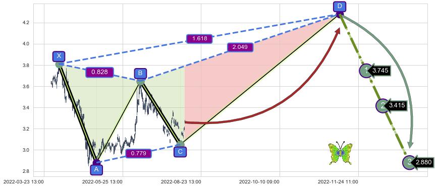 ➣ 谐波蝴蝶:b下跌接近c:猜想支撑性拉升 → 上涨 →【拐点】支撑临近 → 大趋势均值回复