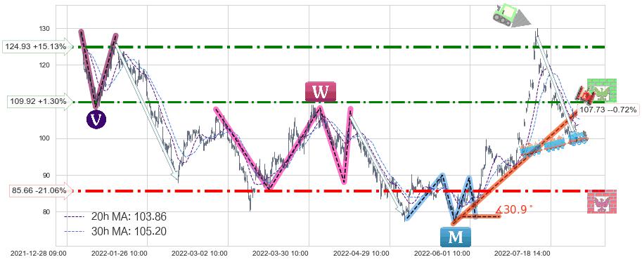 ♞ 20小时均线:103.86,30小时均线:105.20→ 快线<慢线