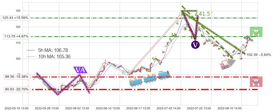 从2022-07-06 13:00至2022-08-10 14:00,共包含50个小时,阶段股价下跌-22.67%,阶段股价变动位移路程比: 1 : 3,下跌趋势角度: 41.5