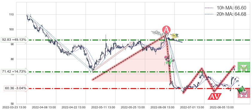 ♘ 阻力价格位71.42,可信任强度65.95%,距离最后交易2022-08-12 14:00形成的收盘价格62.25相差 +14.73%