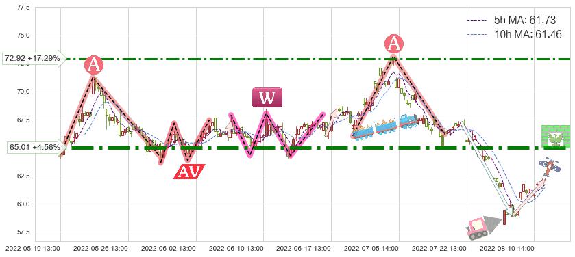 ♘ 阻力价格位65.01,可信任强度90.55%,距离最后交易2022-08-12 14:00形成的收盘价格62.17相差 +4.56%
