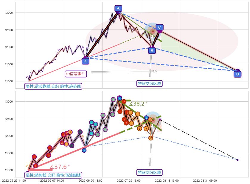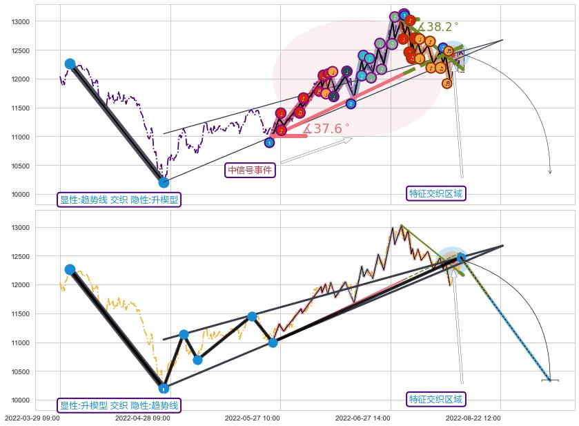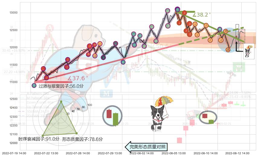 ➢ 2022-07-04 14:00-2022-08-11 13:00下跌趋势存在反转上涨[机会],其原下跌趋势的阻力位(12162.52)已被突破[强支撑信号],原下跌趋势角度: 38.2˚