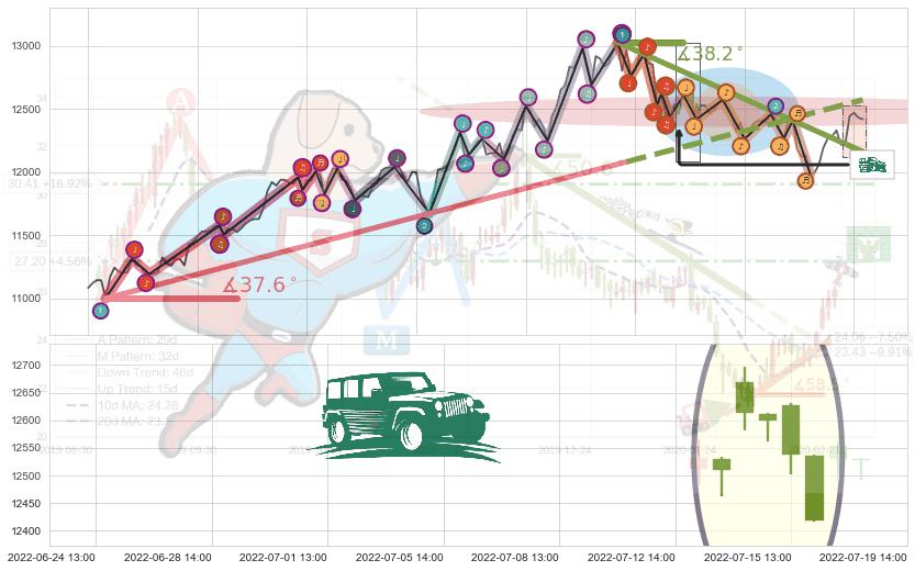 ➢ 2022-05-26 09:00-2022-07-05 14:00上升趋势存在反转[风险],虽然原上升趋势的支撑位(12573.20)已破位,但其支撑效果尚存,原上升趋势角度: 37.6˚