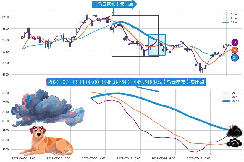 ⚀ 2022-07-06 14:00:00小时-2022-07-20 14:00:00小时显现 3小时-8小时-21小时均线 【乌云密布】卖出点 看空信号,后市看跌,卖出